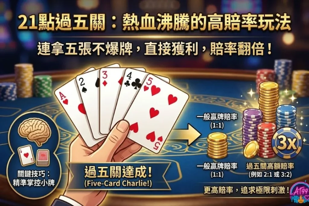 在台灣的玩法中,21點過五關是一個讓人熱血沸騰的規則。如果你連續拿了五張牌還沒有爆牌,不論點數多少,都會直接判定你獲利,且通常賠率會比一般贏牌更高。這需要玩家對小牌有極佳的掌控力,也是許多玩家追求極限刺激的目標。